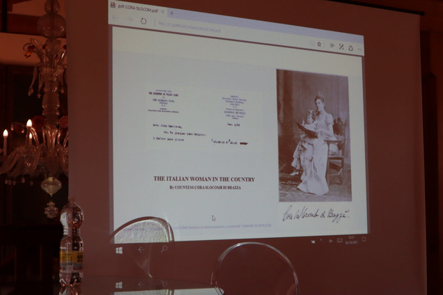 Nel pomeriggio, giunti per l’occasione da Bruxelles, hanno presenziato al convegno i signori Cécile e Corrado Pirzio Biroli. Il signor Corrado Pirzio Biroli, diretto discendente dei conti di Brazzà, felice per l’opportunità avuta di ospitare l’evento nella storica proprietà, ha aggiunto notizie sulla Bandiera della pace che fu ideata da Cora e che viene annualmente issata il 18 maggio davanti al Palazzo di Giustizia dell’Aia in occasione della Giornata mondiale della pace.